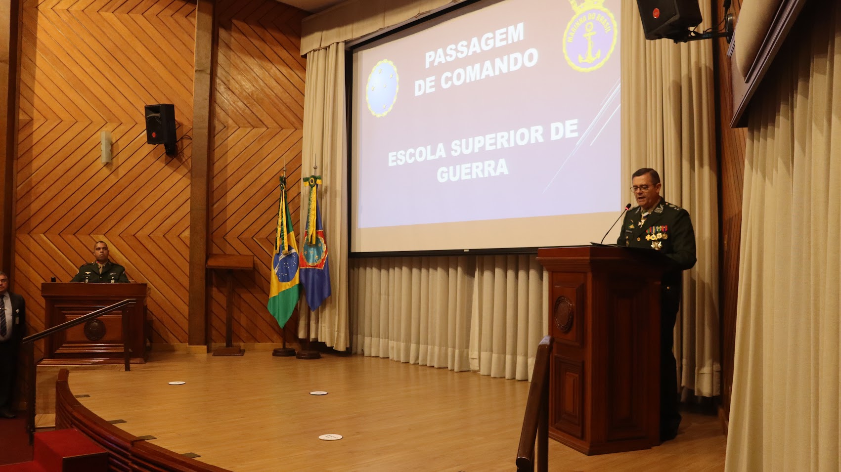 Com a presença de autoridades civis e militares, membros do Corpo Permanente da ESG, familiares e convidados dos Vice-Almirantes Kerr e Cardoso, a solenidade de transmissão do cargo de comandante foi realizada no auditório do Edifício Marechal Juarez Távora. Em seu discurso emocionado, o Vice-Almirante Kerr destacou a honra de encerrar a carreira à frente da Escola Superior de Guerra, relembrou os quase 40 anos de Serviço Ativo na Marinha e desejou um exitoso comando ao Vice-Almirante Cardoso. “No momento em que entrego o comando dessa escola ao meu amigo, Vice-Almirante Marcelo Menezes Cardoso, tenho a plena certeza de que será muito exitoso e feliz, fruto de suas extraordinárias capacidades profissionais. Desejo bons ventos e mares tranquilos”, salientou.