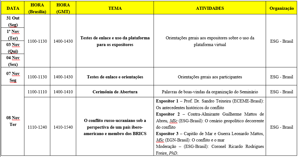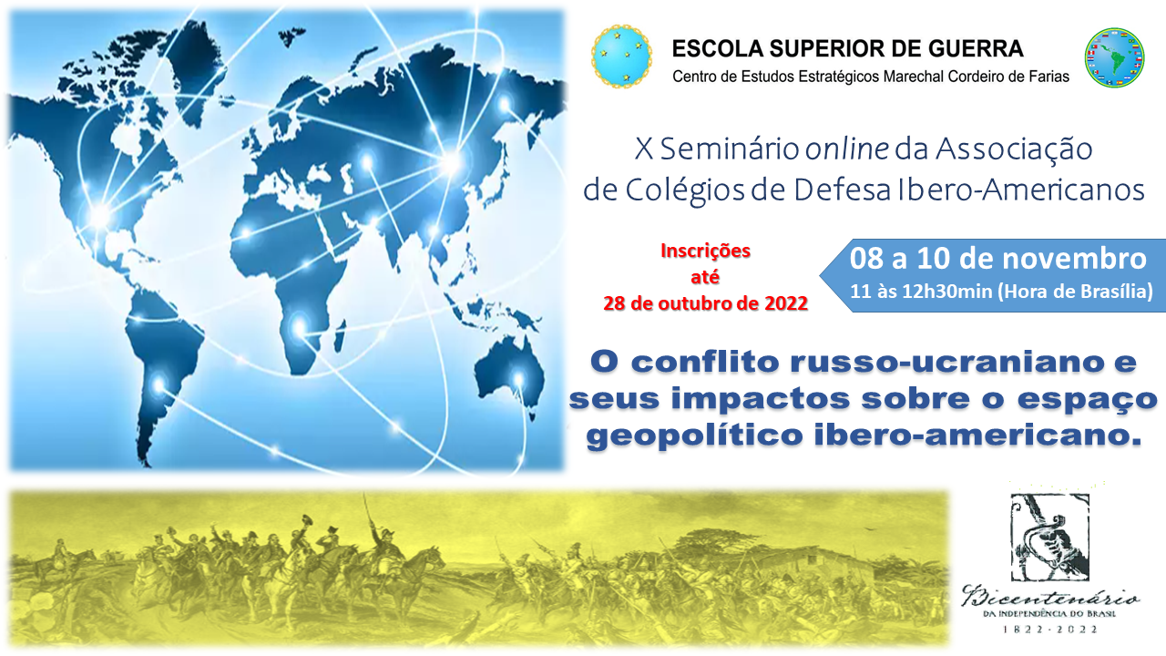 Por ocasião da Videoconferência de Diretores dos Colégios de Defesa Ibero-Americanos, ocorrida em 06 de julho de 2021, foi deliberado que a Escola Superior de Guerra (ESG), no contexto das celebrações do Bicentenário da Independência do Brasil, organizaria no segundo semestre de 2022, uma atividade acadêmica no formato virtual, abordando o tema “O conflito russo-ucraniano e seus impactos no espaço geopolítico ibero-americano”.