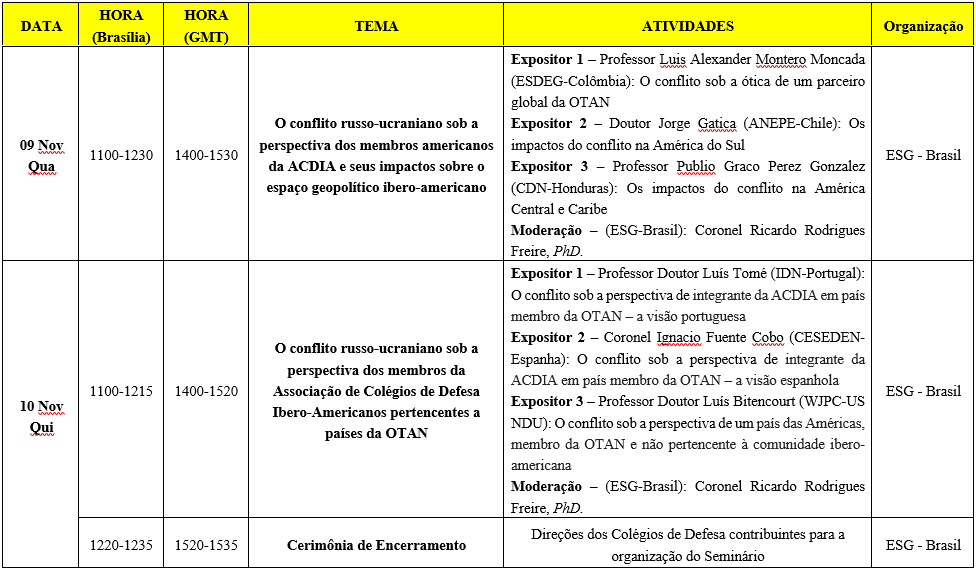 A estrutura proposta para o dito Seminário inclui três jornadas de atividades, uma contendo a visão brasileira sobre o contencioso, uma vez que o Brasil possui parcerias comerciais e diplomáticas sólidas com ambas as partes. Numa segunda jornada, enfocando a ótica de países americanos da ACDIA sobre o conflito e seus impactos na geopolítica ibero-americana. E, uma terceira e última etapa, seria abordada a questão da OTAN (Organização do Tratado do Atlântico Norte), por meio da visão dos membros da ACDIA pertencentes países que integram essa Aliança Militar.