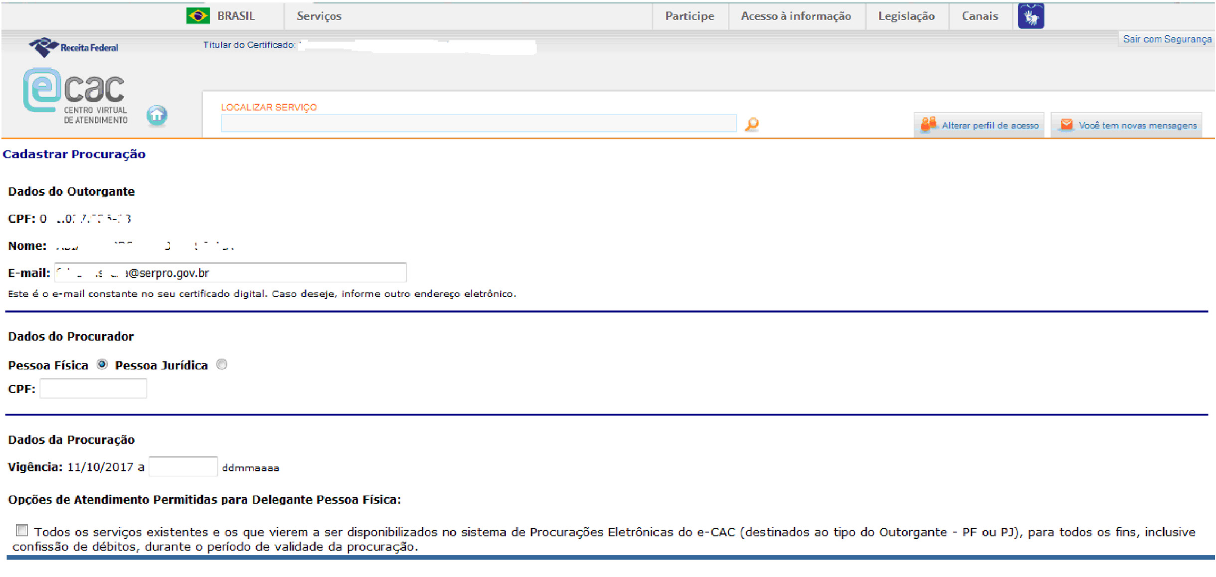 Pessoa Física com procuração cadastrada na RFB. |