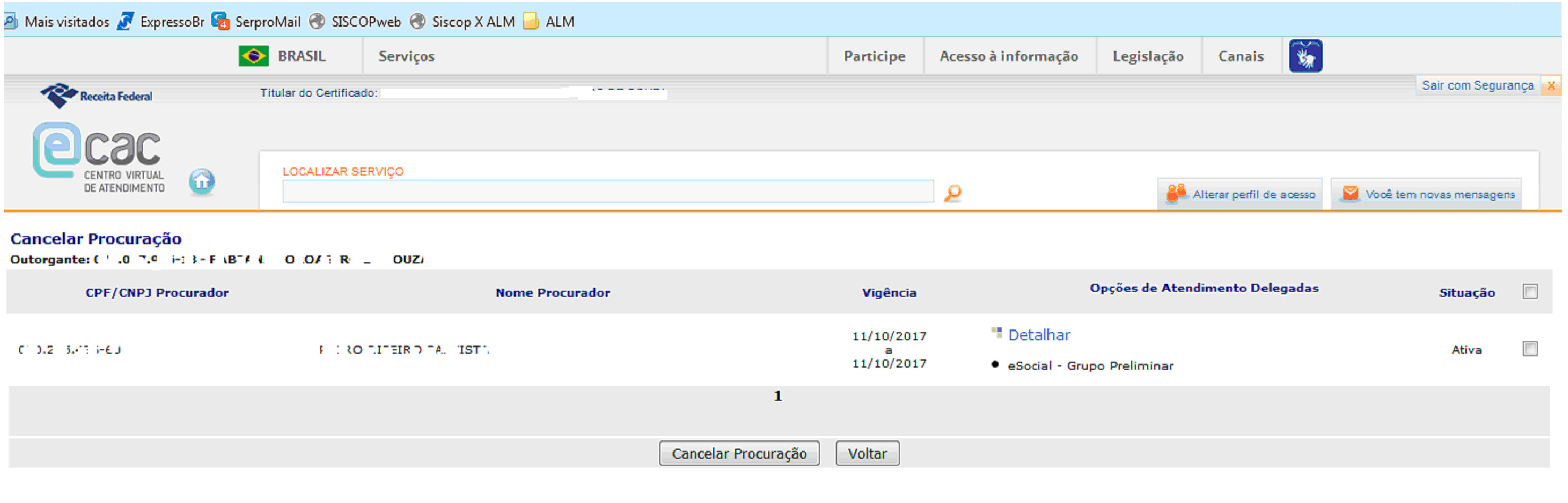 6 - Para cancelar, selecionar a opção Cancelar procuração