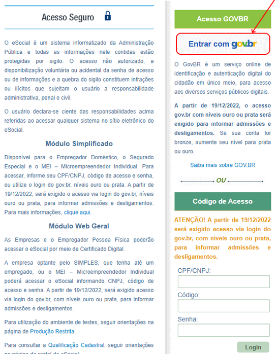 - Limitação no login: desde o dia 19/12/2022 não é possível o envio de eventos de admissão e desligamento com a utilização de código de acesso. A partir de 13/02/2023 não será possível o envio de eventos trabalhistas (afastamentos, férias e alterações contratuais). A partir de abril/2023 o login por código de acesso será descontinuado definitivamente do eSocial.