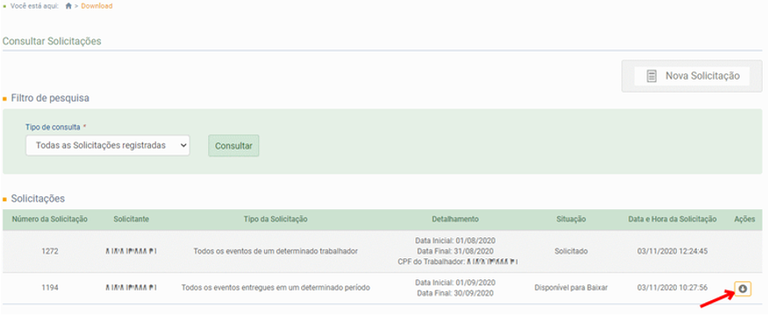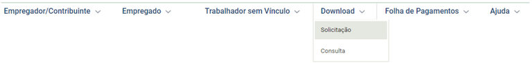 No menu do eSocial, clicar em "Downloads", depois em "Solicitação" e selecionar o filtro desejado: