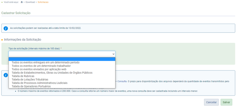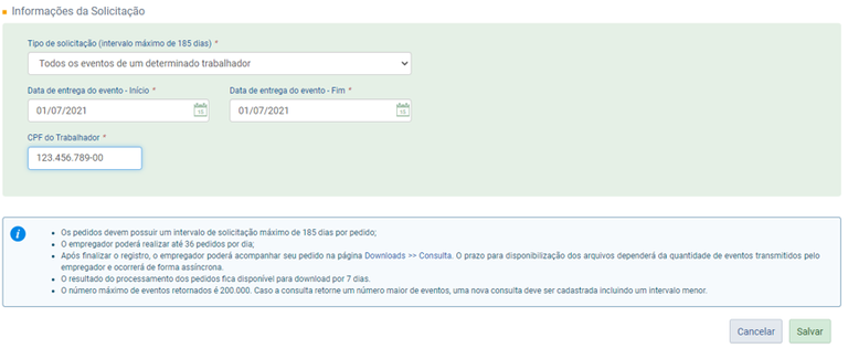 - Caso o pedido resulte em mais de 200 mil registros (eventos), não haverá processamento (situação "excedido") e o empregador terá que fazer novos pedidos com períodos menores de intervalo, ou utilizar outro filtro;