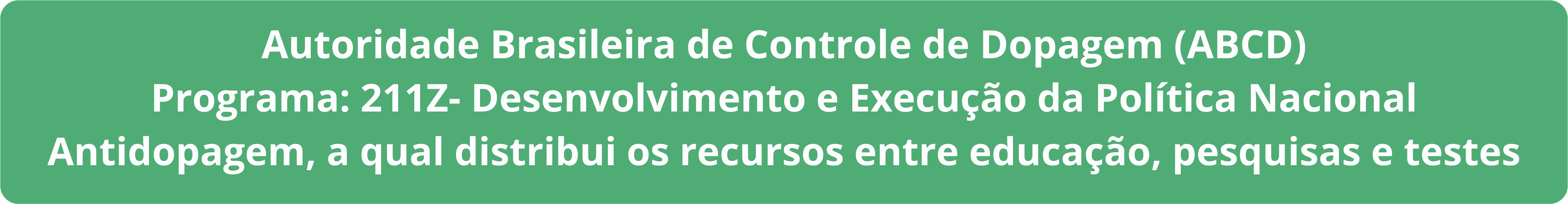 Controle de Testes e Investigação | Número de testes antidopagem realizados. Total de 4.572 até 24/11/2023 | Realização, por agentes credenciados, de testes de controle de dopagem | Detectar o uso de substâncias ou métodos proibidos eventualmente utilizados por atletas de acordo com o Plano de Distribuição de testes da ABCD. Seguindo os normativos da Agência Mundial Antidopagem(AMA/WADA) |