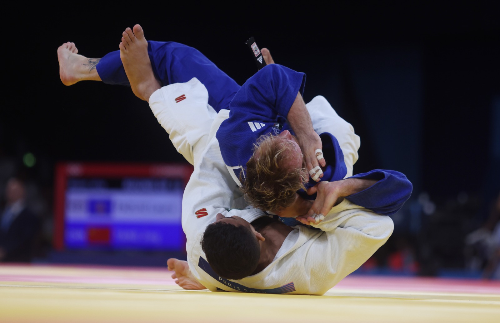 O judoca brasileiro Guilherme Schmidt, de kimono azul. Foto: Luiza Moraes/COB