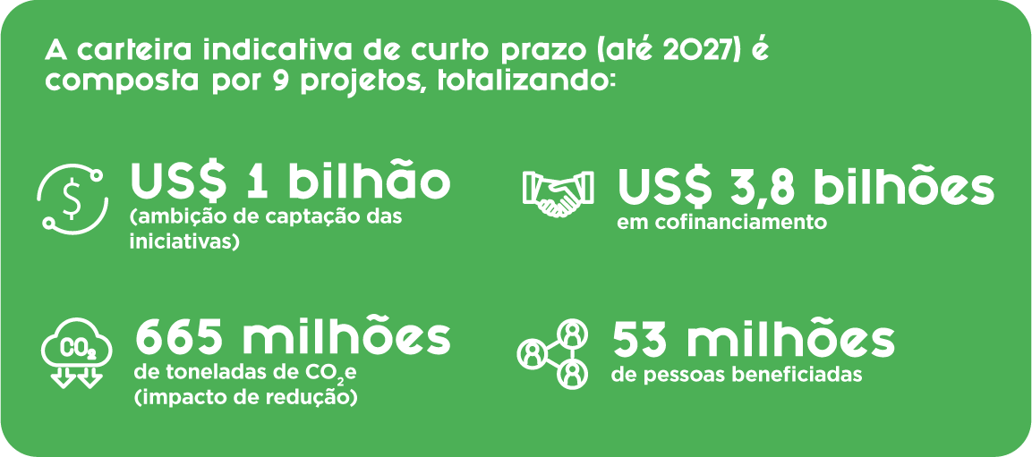 A carteira brasileira junto ao GCF está dividida em dois horizontes temporais: curto prazo (até 2027, seguindo o segundo ciclo de reposição de recursos - GCF-2) e médio prazo (a serem aprovados a partir de 2027):