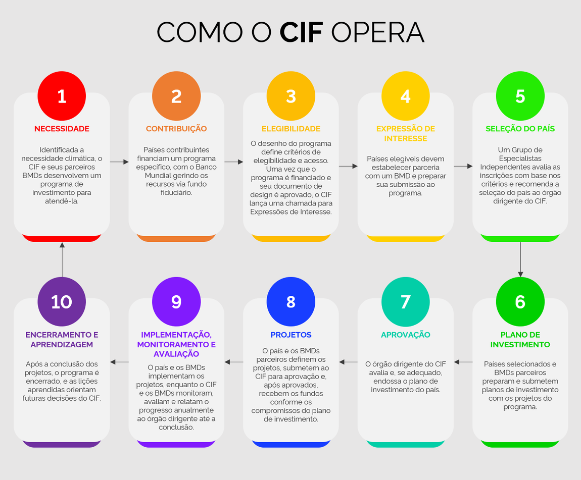 O processo de acesso ao CIF ocorre em etapas específicas, iniciando com o envio de uma Expressão de Interesse pelo governo do país interessado em participar de um determinado Programa de Investimento que esteja com uma chamada aberta.