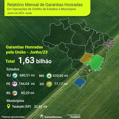 m junho, a União pagou R$ 1,63 bilhão em dívidas garantidas dos entes subnacionais, elevando para R$ 6,91 bilhões o valor total honrado em 2023. Os dados estão no Relatório de Garantias Honradas pela União em Operações de Crédito, divulgado nesta sexta-feira (7/7) pelo Tesouro Nacional. No mês, foram honrados débitos de R$ 680,51 milhões do estado do Rio de Janeiro, R$ 633,60 milhões do estado de Minas Gerais, R$ 144,04 milhões do estado de Pernambuco, R$ 77,17 milhões do estado de Goiás, R$ 60,20 milhões do estado do Rio Grande do Sul e R$ 32,82 milhões do município de Taubaté (SP).