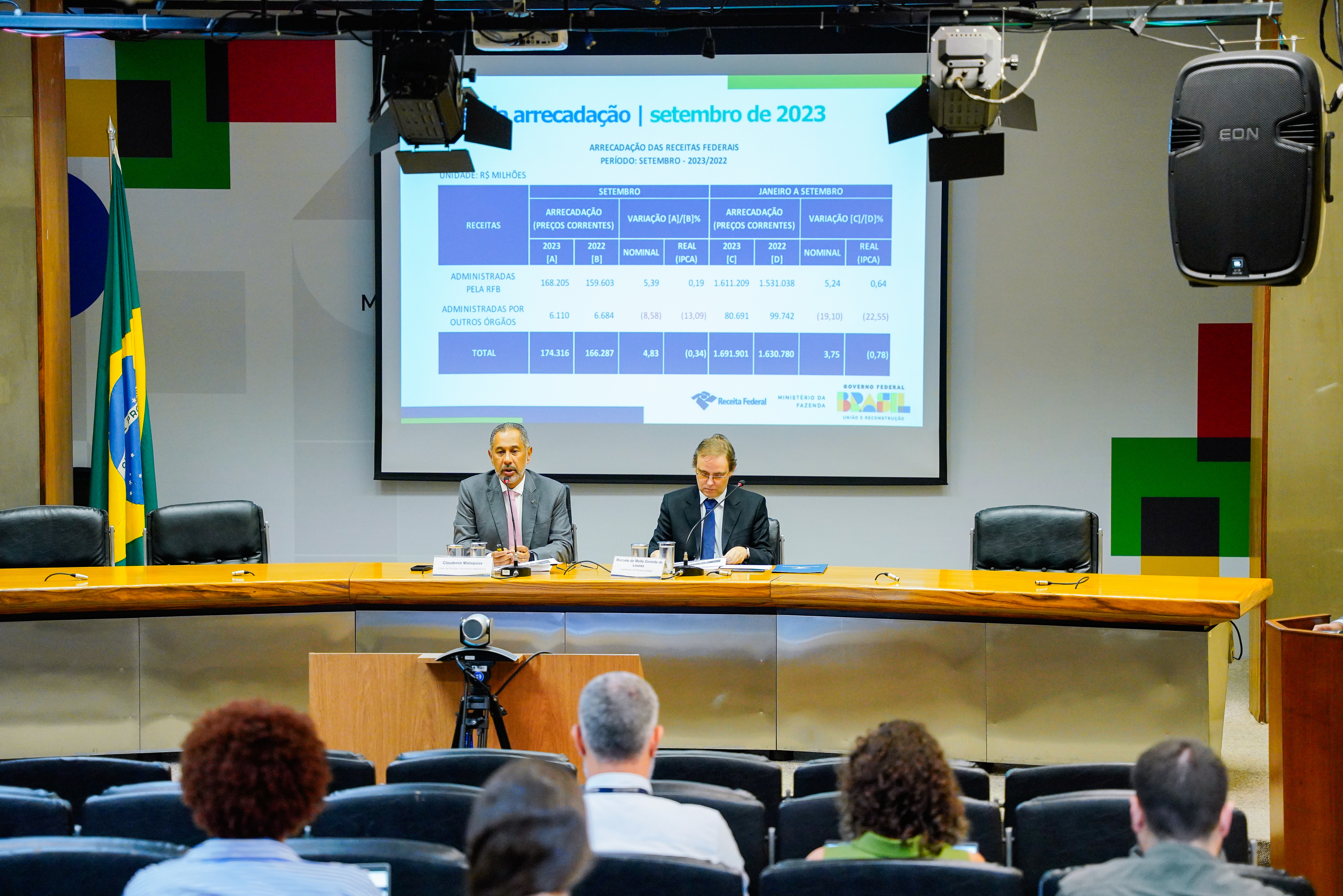 O chefe do Centro de Estudos Tributários e Aduaneiros, Claudemir Malaquias e o coordenador de Previsão e Análise da Receita Federal, Marcelo Gomide divulgam os resultados