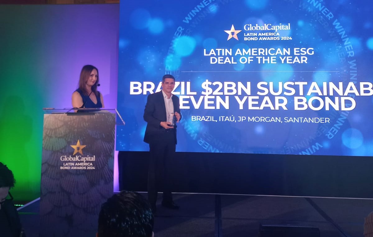 O Brasil venceu nesta terça-feira (16/4) a categoria Emissão ESG Latino-Americana do Ano (Latin American ESG Deal of the Year) do Latin America Bond Awards, premiação promovida pela Global Capital. O prêmio, entregue em cerimônia realizada em Nova Yorque, reflete o reconhecimento pela eficiente emissão do título ESG feita, em novembro de 2023, pelo Tesouro Nacional.