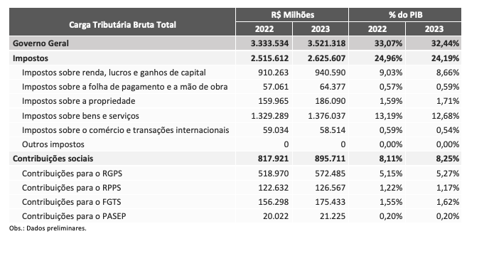 Quadro com dados do Boletim de Estimativa da Carga Tributária Bruta do Governo Geral de 2023