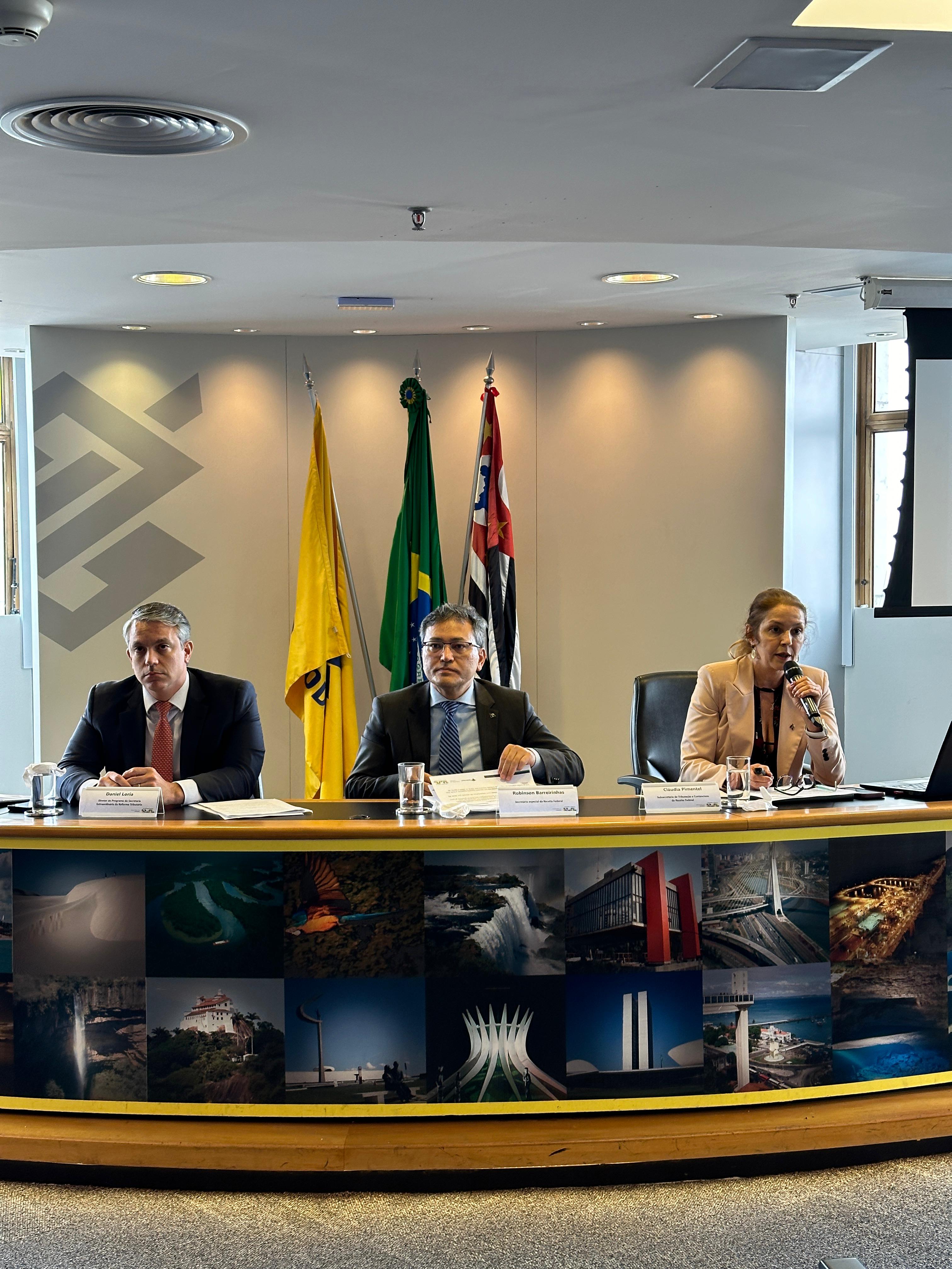 O diretor da Sert Daniel Loria (E), o secretário Robinson Barreirinhas e a subsecretária Cláudia Pimentel esclarecem, durante coletiva, o alcance da MP 1.262/2024 Foto – Divulgação/MF