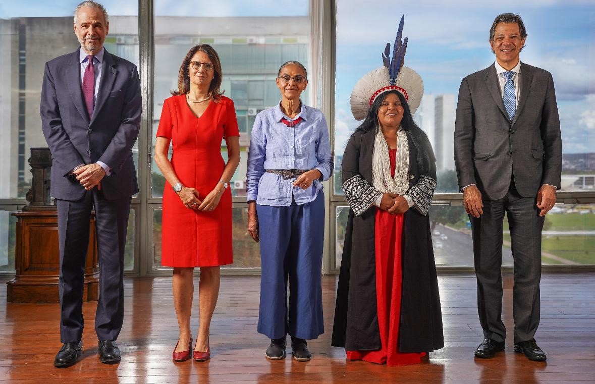 O ministro Haddad e autoridades do governo e da COP30 anunciaram a criação de quatro círculos de apoio visando à conferência, que será realizada em novembro - Foto: Diogo Zacarias/MF