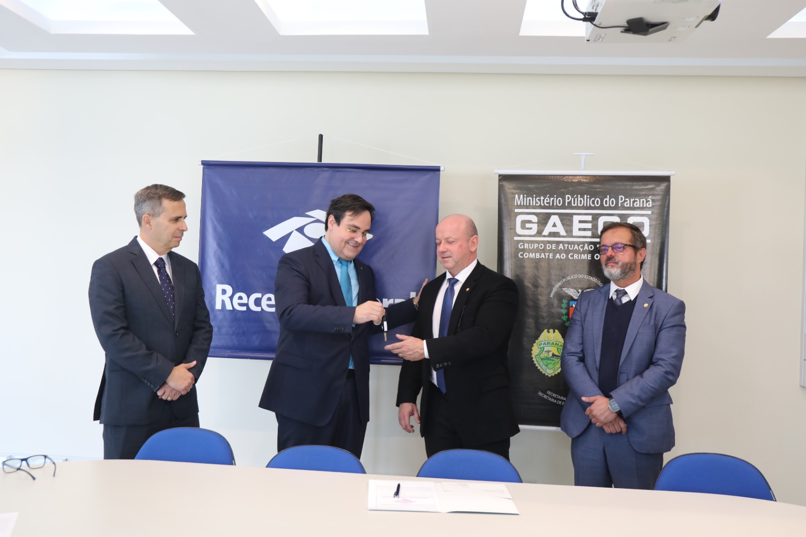 Autoridades da Receita, do Gaeco e de órgãos estaduais do Paraná participam da cerimônia de entrega dos veículos na sede da 9ª Região Fiscal, em Curitiba – Foto: Divulgação/Receita Federal