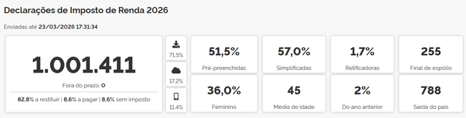 Além da quantidade de declarações entregues, é possível acessar estatísticas, como a forma de declaração (online, aplicativo ou programa gerador de declaração), porcentagem de declarações feitas no modelo simplificado e completo, dentre outros dados.