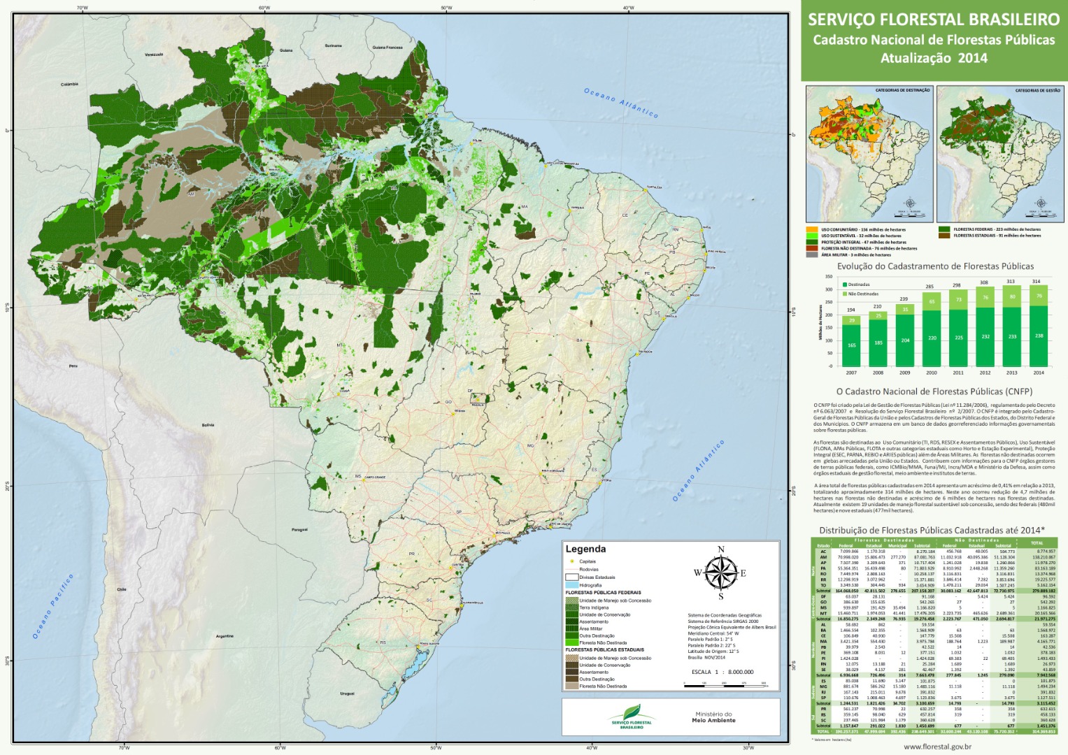 A atualização do Cadastro Nacional de Florestas Públicas (CNFP) foi concluída em dezembro de 2014. A área total de florestas públicas cadastradas em 2014 corresponde a aproximadamente 314,37 milhões de hectares. Este valor equivale a 36,92% do território brasileiro e representa um acréscimo de 0,41% (1,3 milhões de ha) em relação ao total de áreas cadastradas em 2013. A variação foi maior quando considera-se a destinação das florestas cadastradas, tendo ocorrido uma redução de 4,7 milhões de hectares na área não destinada e um acréscimo de 6 milhões de hectares de florestas destinadas. Assim, foram registradas mudanças de destinação em pelo menos 1,9% das áreas florestais do CNFP.