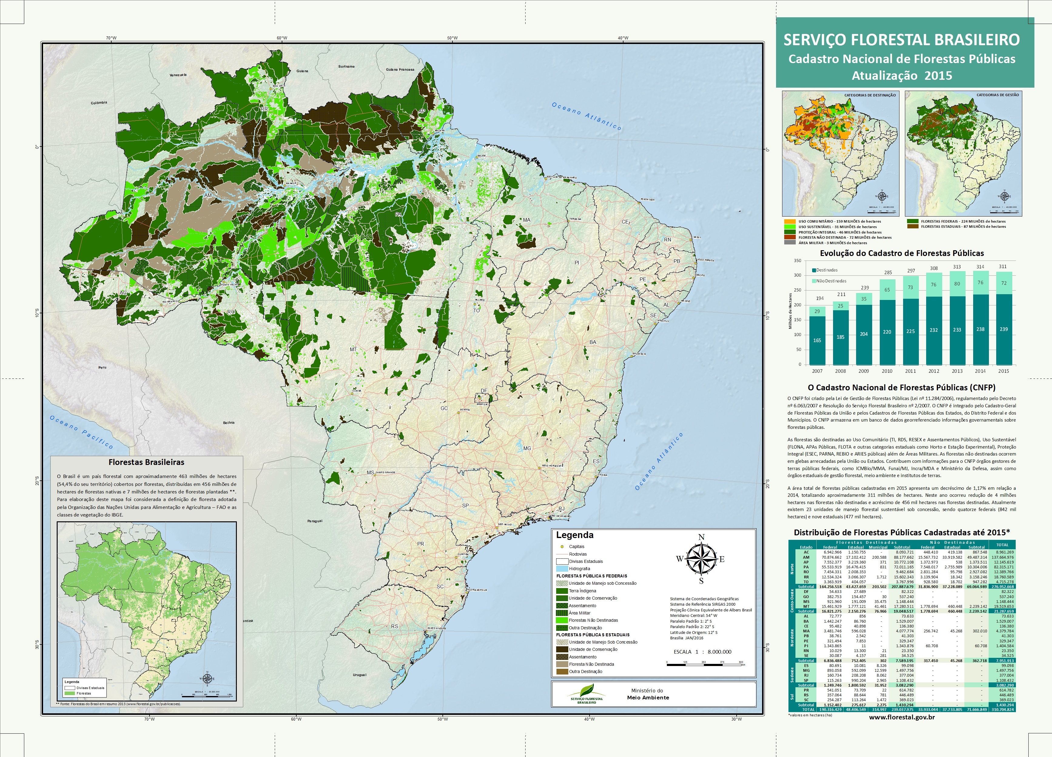 A atualização do Cadastro Nacional de Florestas Públicas (CNFP) foi concluída em dezembro de 2015. A área total de florestas públicas cadastradas em 2015 corresponde a aproximadamente 310,7 milhões de hectares. Este valor equivale a 36,5% do território brasileiro e representa um decréscimo de 1,17% (3,6 milhões de ha) em relação ao total de áreas cadastradas em 2014. A variação foi maior quando considera-se a destinação das florestas cadastradas, tendo ocorrido uma redução de 4 milhões de hectares na área não destinada e um acréscimo de 0,3 milhões de hectares de florestas destinadas.
