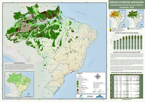 A atualização do Cadastro Nacional de Florestas Públicas (CNFP) foi concluída em dezembro de 2015. A área total de florestas públicas cadastradas em 2016 corresponde a aproximadamente 312,6 milhões de hectares. Este valor equivale a 37% do território brasileiro e representa um acréscimo de 0,64% em relação a 2015. A variação foi maior quando considera-se a destinação das florestas cadastradas, tendo ocorrido uma redução de 1,9 milhões de hectares na área não destinada e um acréscimo de 3,9 milhões de hectares de áreas destinadas.