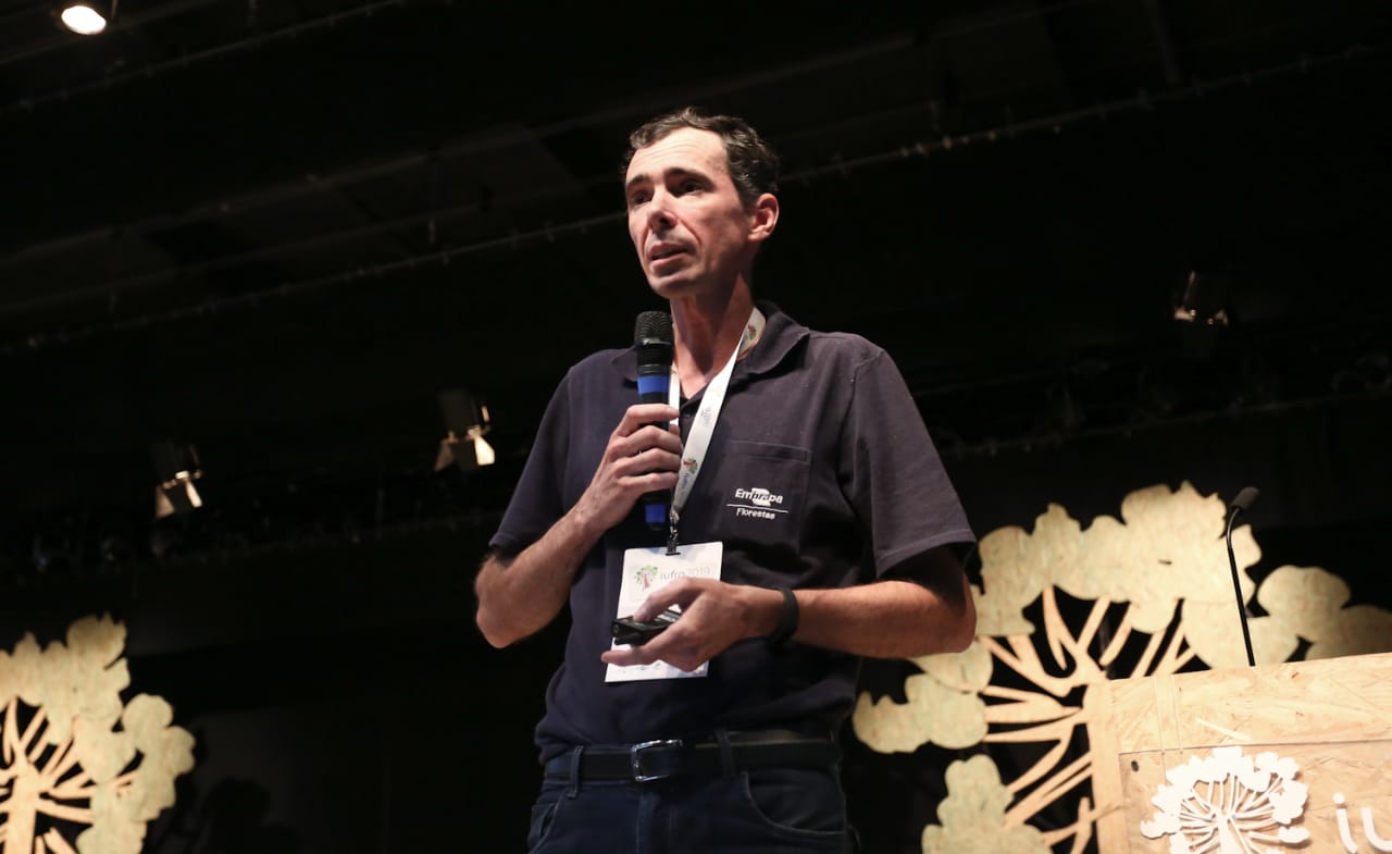 O diretor de Pesquisa e Informação Florestal do Serviço Florestal Brasileiro, Joberto Veloso, o pesquisador da Embrapa, Erich Schaitza - que fez a mediação, o professor da Universidade Regional de Blumenau, Alexander Vibrans, a pesquisadora da Embrapa, Valderez Souza, o pesquisador da Embrapa Florestas, Ivar Wendling, e o professor da Unicentro, Afonso Figueiredo, conduziram, na manha desta sexta-feira (4/10), o evento paralelo “Manejando Araucária”, dentro da programação do Congresso Mundial da Iufro 2019.