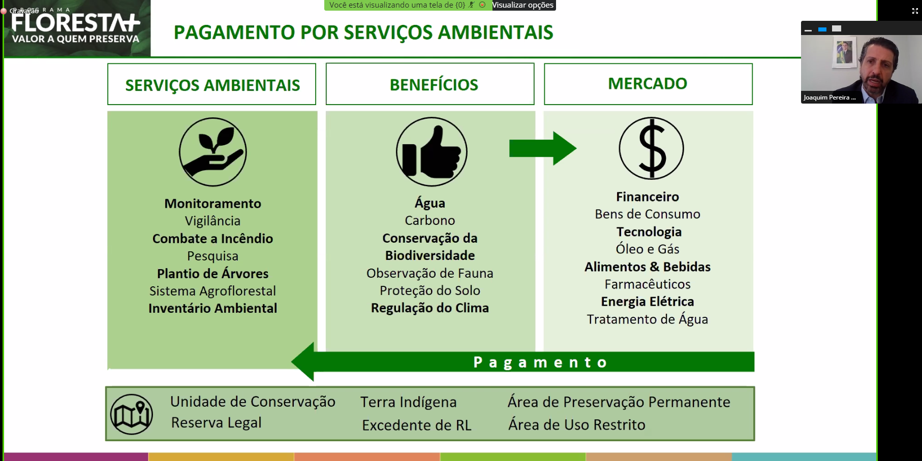 “Serviços ambientais são as atividades do homem para cuidar da florestal. O Programa tem como objetivo e foco principal mudar o olhar do quanto vale um hectare de floresta para quanto vale proteger a floresta. Tem muito estudo para dizer quanto vale a biodiversidade, quanto vale a Amazônia, mas tem muito pouco estudo ou realidade sobre quanto custa cuidar da Amazônia. Qual o custo de cuidar das áreas depois de manejadas, qual o custo de cuidar de uma reserva legal? Tem de tirar o foco da árvore para colocar o foco no homem que cuida da floresta e que faz a atividade de preservação”, afirmou Joaquim Leite.
