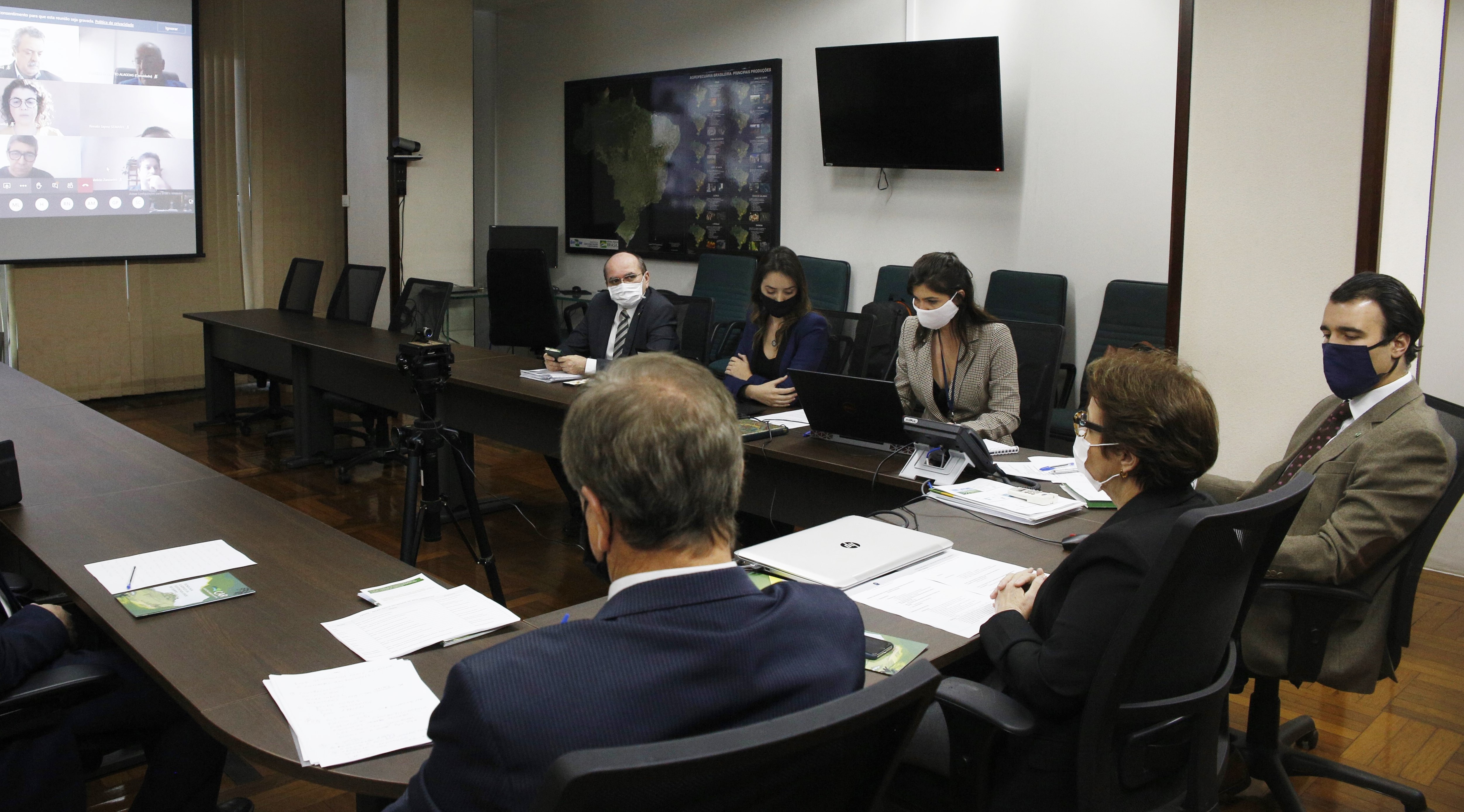 A ministra da Agricultura, Pecuária e Abastecimento, Tereza Cristina, e o Diretor-Geral do Serviço Florestal Brasileiro (SFB), Valdir Colatto, dirigentes desses órgãos, Secretarias Estaduais e institutos de Meio Ambiente se reuniram, por videoconferência, na manhã desta sexta-feira (10) para conhecerem a plataforma da análise dinamizada dos cadastros.