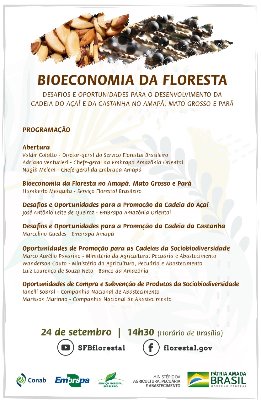 O Serviço Florestal Brasileiro (SFB) promove o Seminário “Bioeconomia da Floresta: Desafios e Oportunidades para o Desenvolvimento da Cadeia do do Açaí e da Castanha nos estados do Pará, Amapá e Mato Grosso”. O evento virtual vai acontecer amanhã (24), às 14h30 (horário de Brasília) e contará com a participação de pesquisadores da Embrapa, da Secretaria de Política Agrícola do Ministério da Agricultura, Pecuária e Abastecimento (Mapa), da Companhia Brasileira de Abastecimento (Conab), do Banco da Amazônia e do SFB.