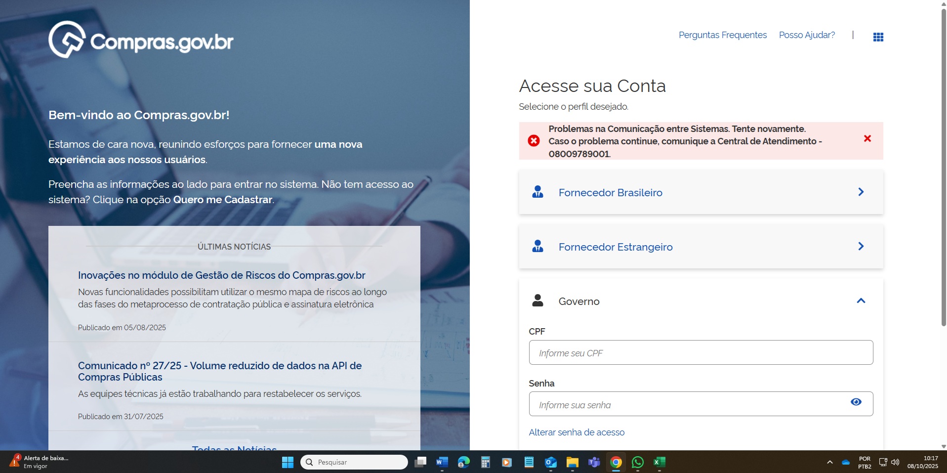 - Erro de acesso Compras.Gov (08/10/2025, 10h)