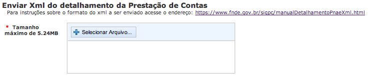 Atualização 25/07/2018: O envio deve ser realizado pelo Contas Online (SIGPC) no endereço: https://www.fnde.gov.br/sigpc/ pelo menu Prestação de Contas Online, opção Enviar Xml do detalhamento da Prestação de Contas, como nas imagens abaixo: