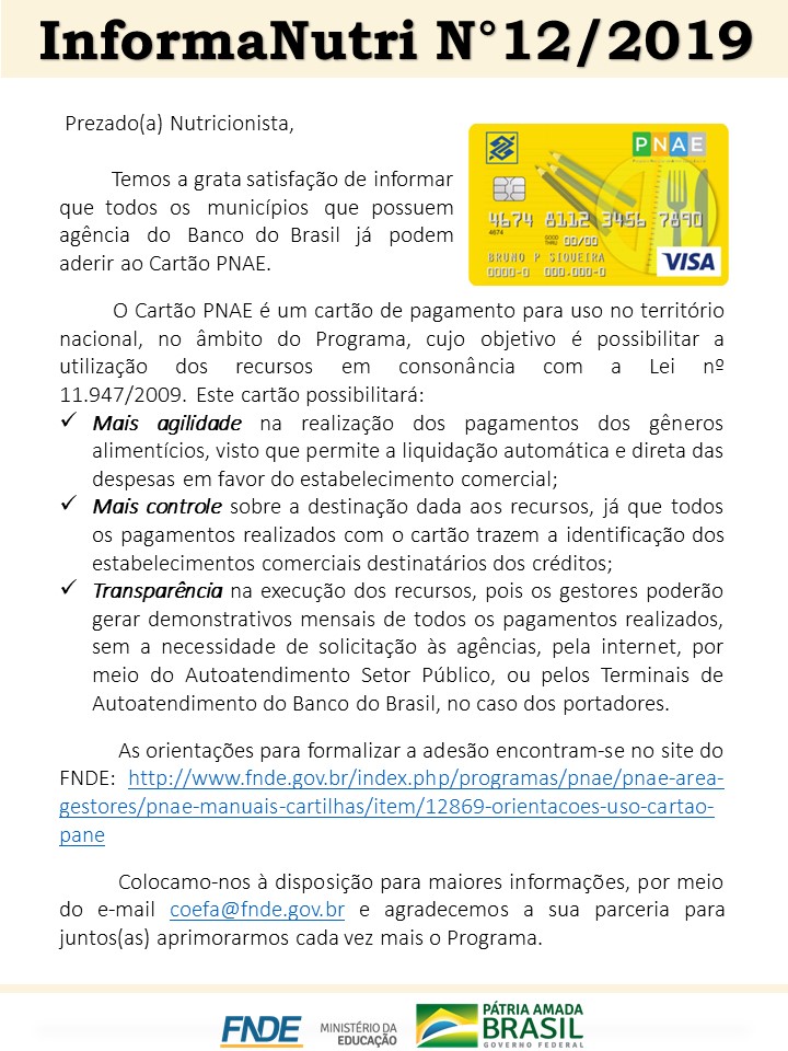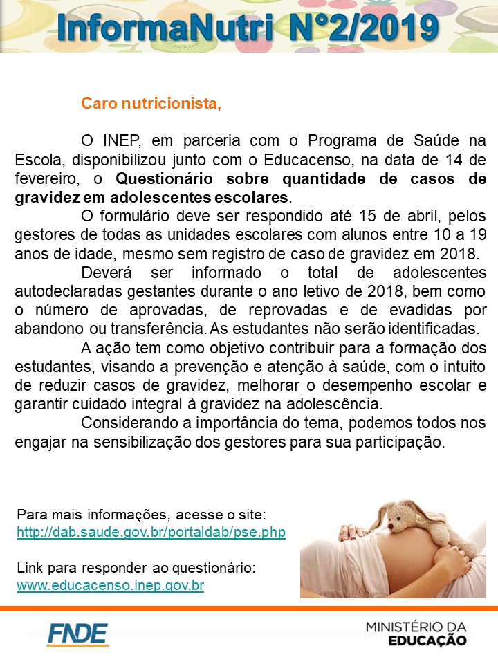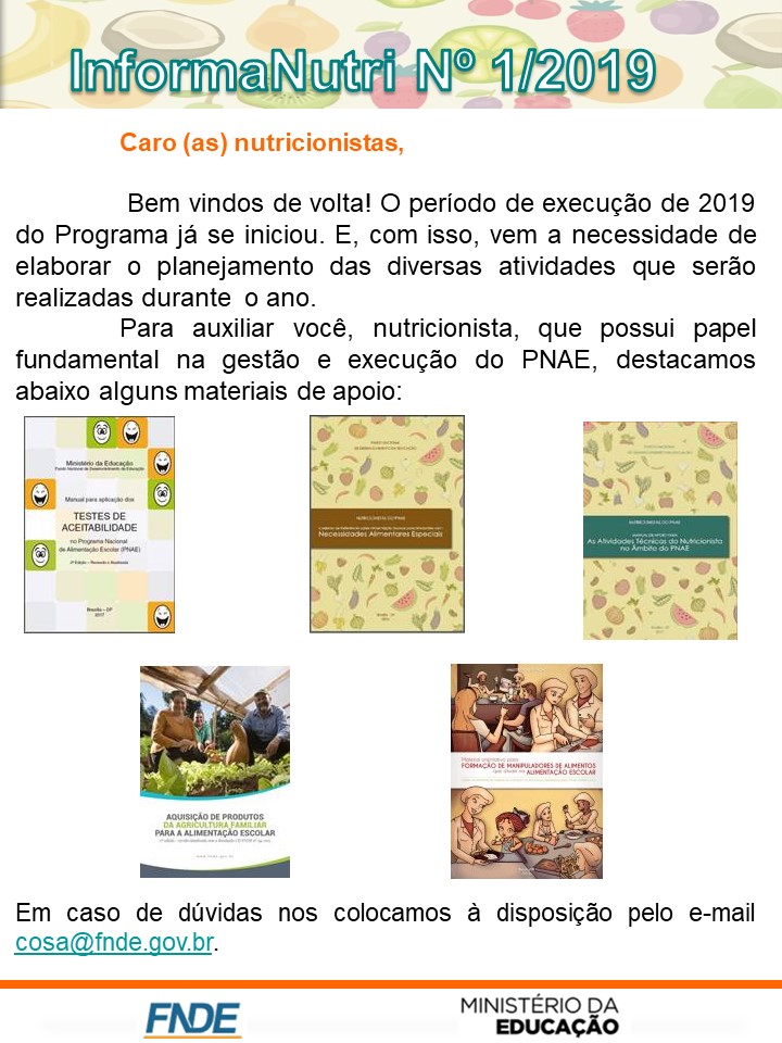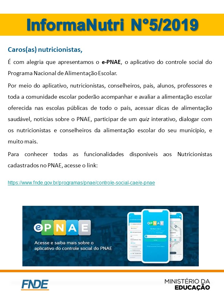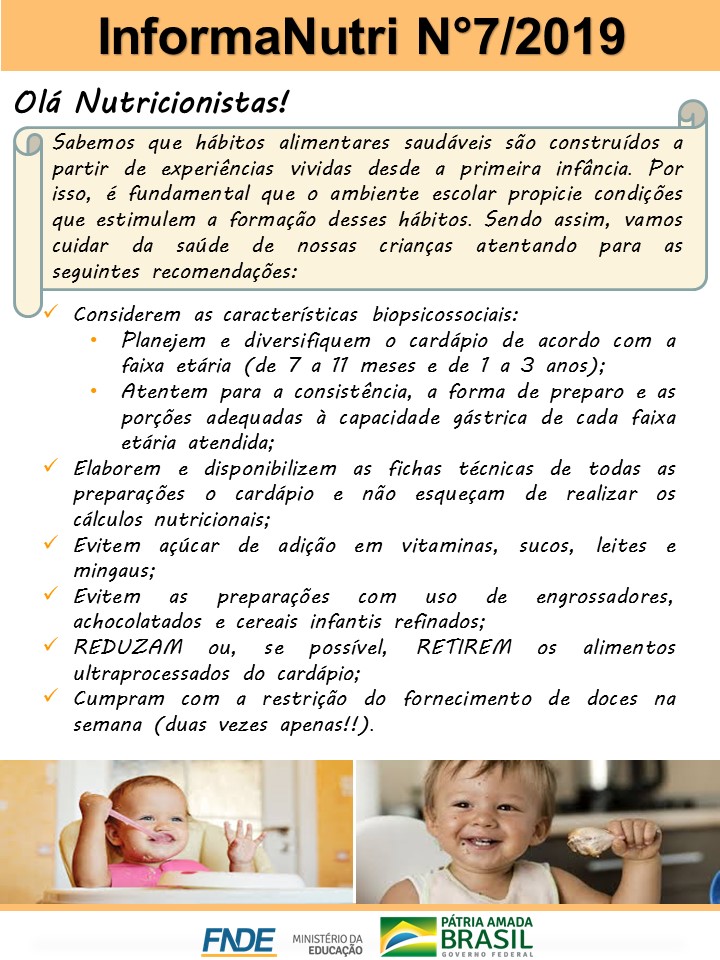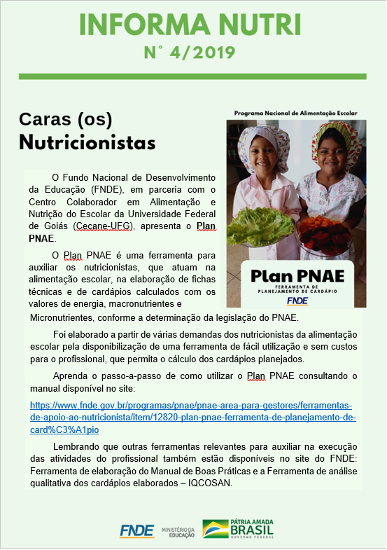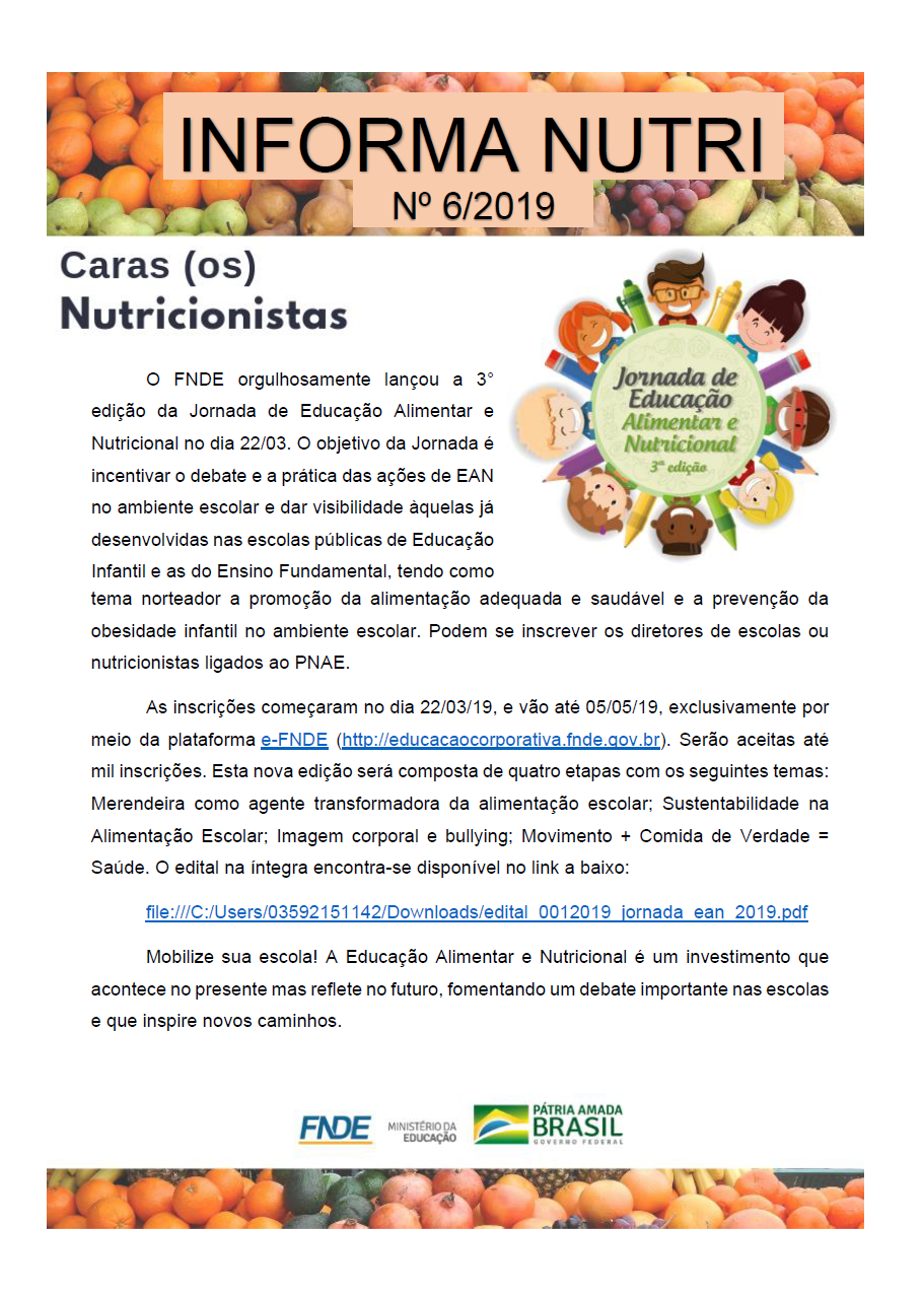 - InformaNutri nº 19 - Nota Técnica: Inclusão da Educação Alimentar e Nutricional no currículo escolar e no Projeto Político-Pedagógico de escolas da Educação Básica beneficiárias do Programa Nacional de Alimentação Escolar nas redes federal, estadual, distrital e municipal