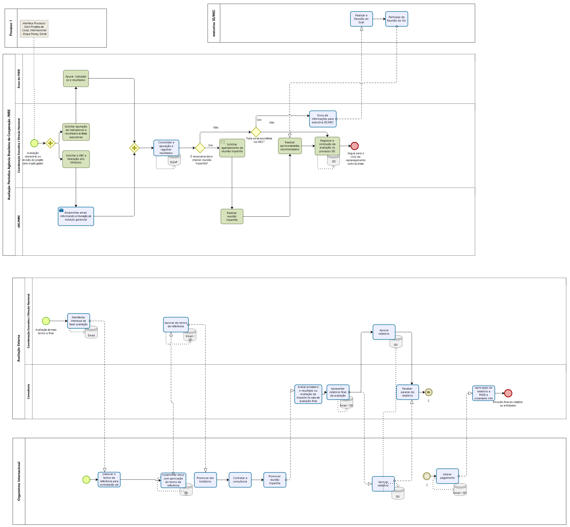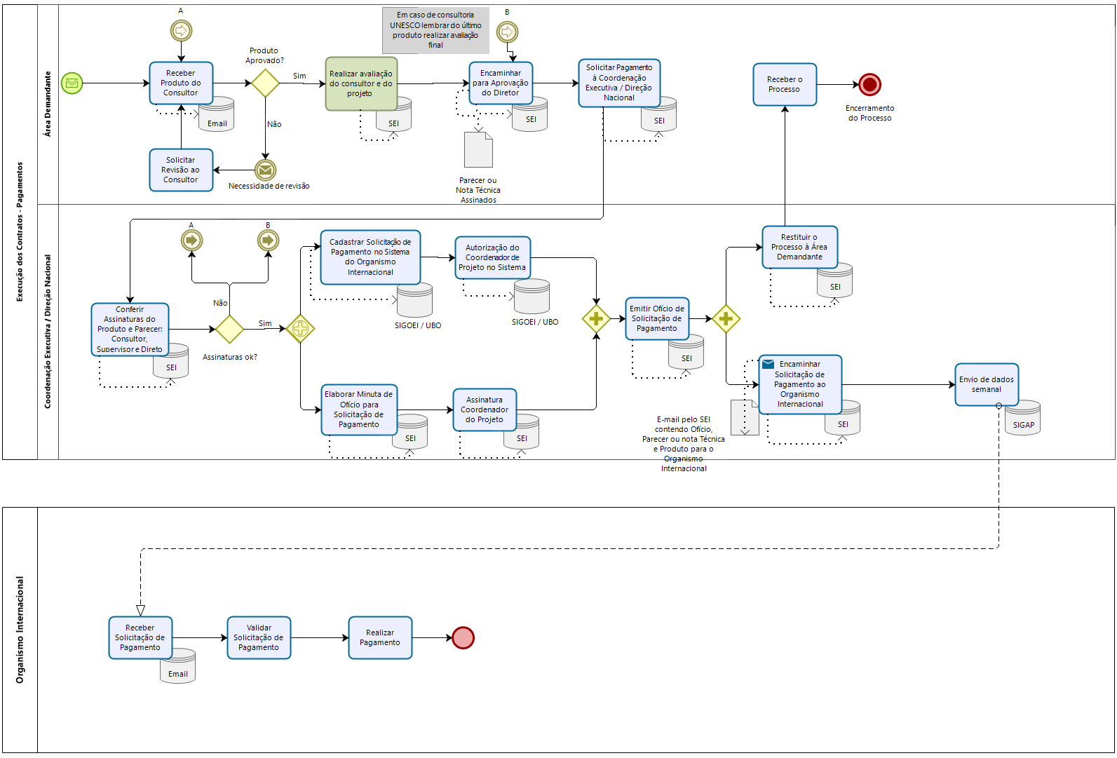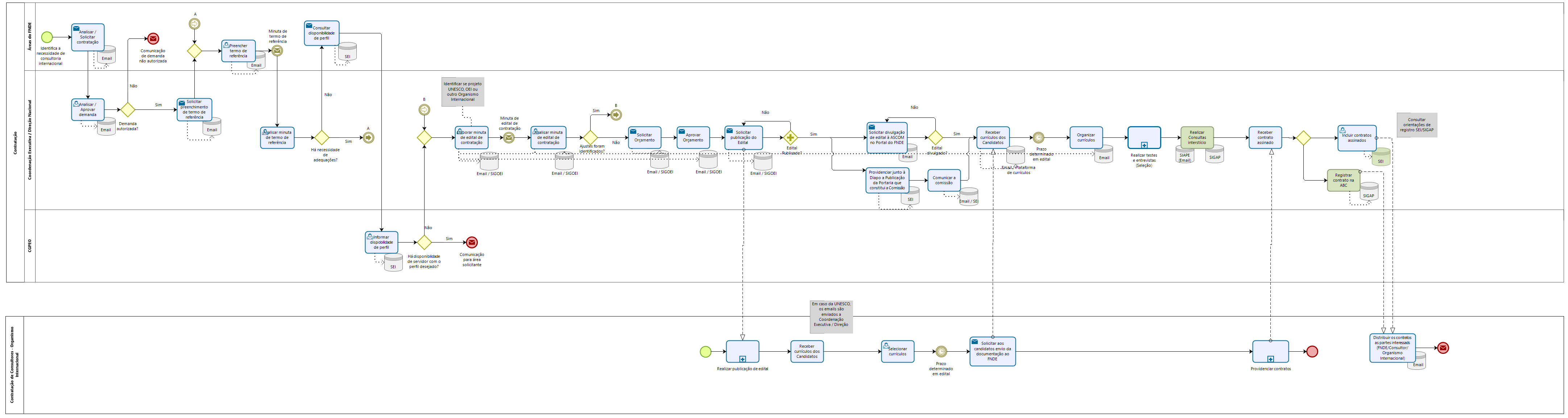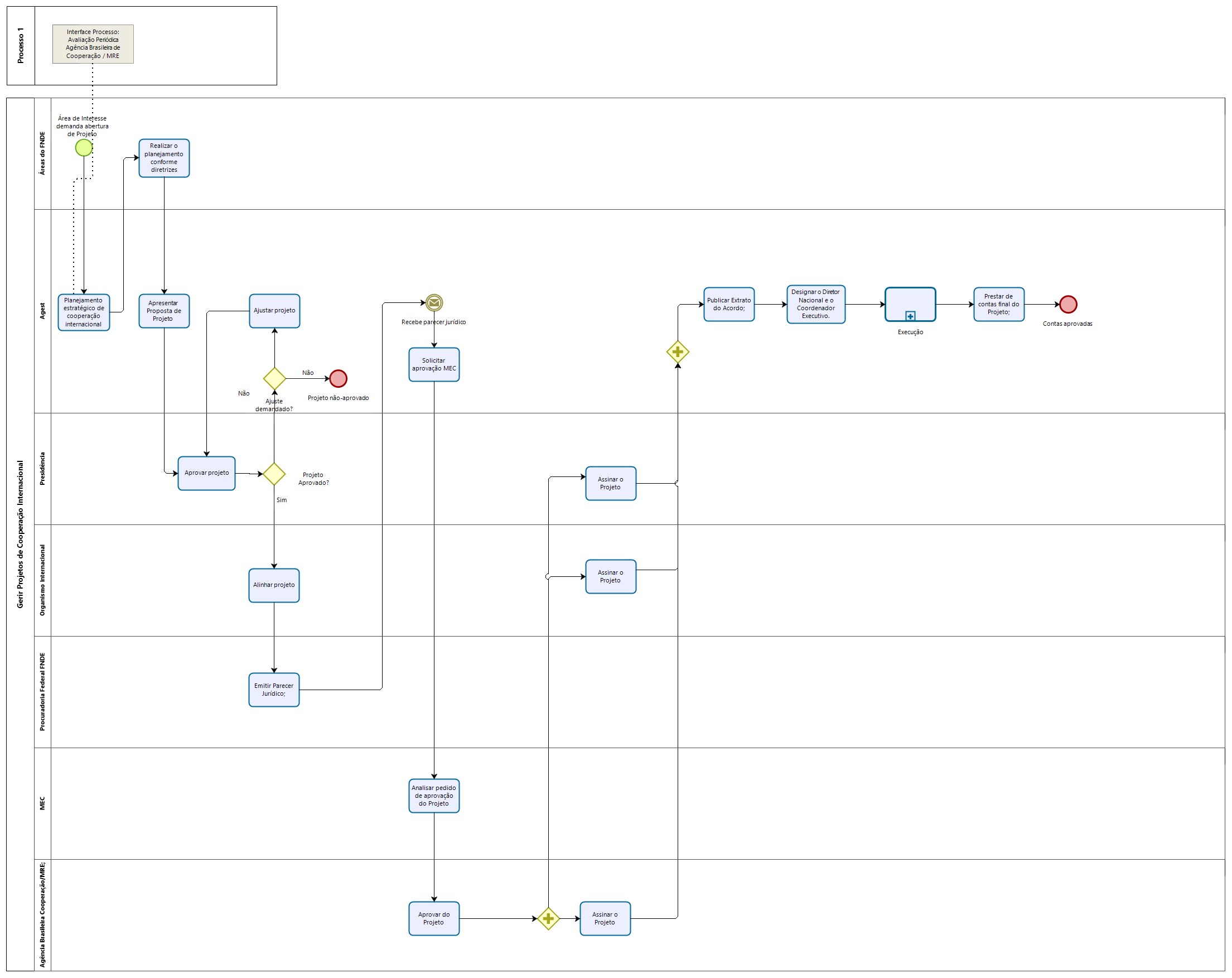 Atualmente, o processo é composto pelos seguintes atores: Áreas técnicas do FNDE, Agest, Presidência do FNDE, Organismo Internacional, Procuradoria Federal, MEC e Agência Brasileira de Cooperação/MRE.