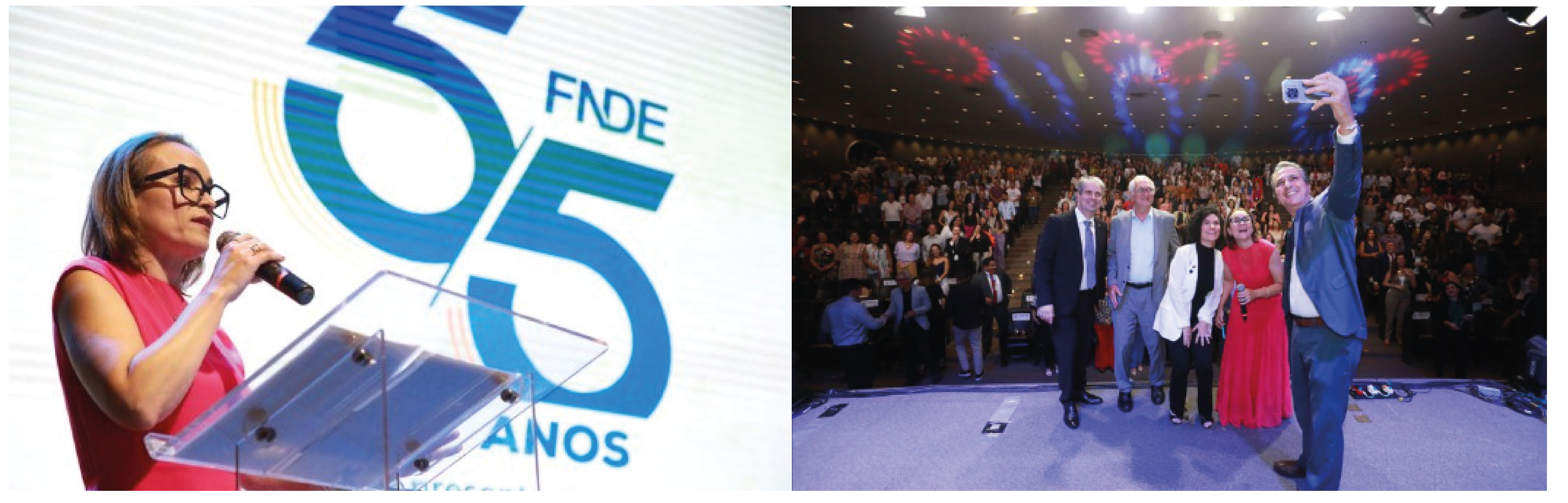 O Fundo Nacional de Desenvolvimento da Educação (FNDE) completou, no dia 21 de novembro, 55 anos de histórias em prol da educação pública brasileira. A cerimônia, que aconteceu no Museu Nacional da República, em Brasília, contou com a presença do ministro da Educação, Camilo Santana, da presidente do FNDE, Fernanda Pacobahyba, do vice-presidente de Governo do Banco do Brasil, José Sasseron, do diretor de operações dos Correios, Temistócles de Azevedo, e da diretora-executiva da Escola Nacional de Administração Pública (Enap), Natália Teles. Também participaram colaboradores, servidores e técnicos do FNDE, além de secretários e secretárias do MEC, representantes das vinculadas e parceiros.