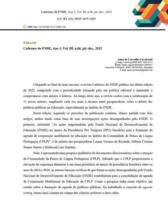 Em consonância com a proposta de publicação contínua, esta edição traz dois artigos que destacam ações desenvolvidas pelo Fundo Nacional de Desenvolvimento da Educação (FNDE). O primeiro aborda a atuação do Fundo na Presidência Pro Tempore da Comunidade de Países de Língua Portuguesa (CPLP), contribuindo para a construção de uma agenda de cooperação educacional entre os países lusófonos. O segundo analisa os avanços legislativos do Programa Nacional de Alimentação Escolar (PNAE), ressaltando sua importância para a promoção da segurança alimentar nas escolas públicas.