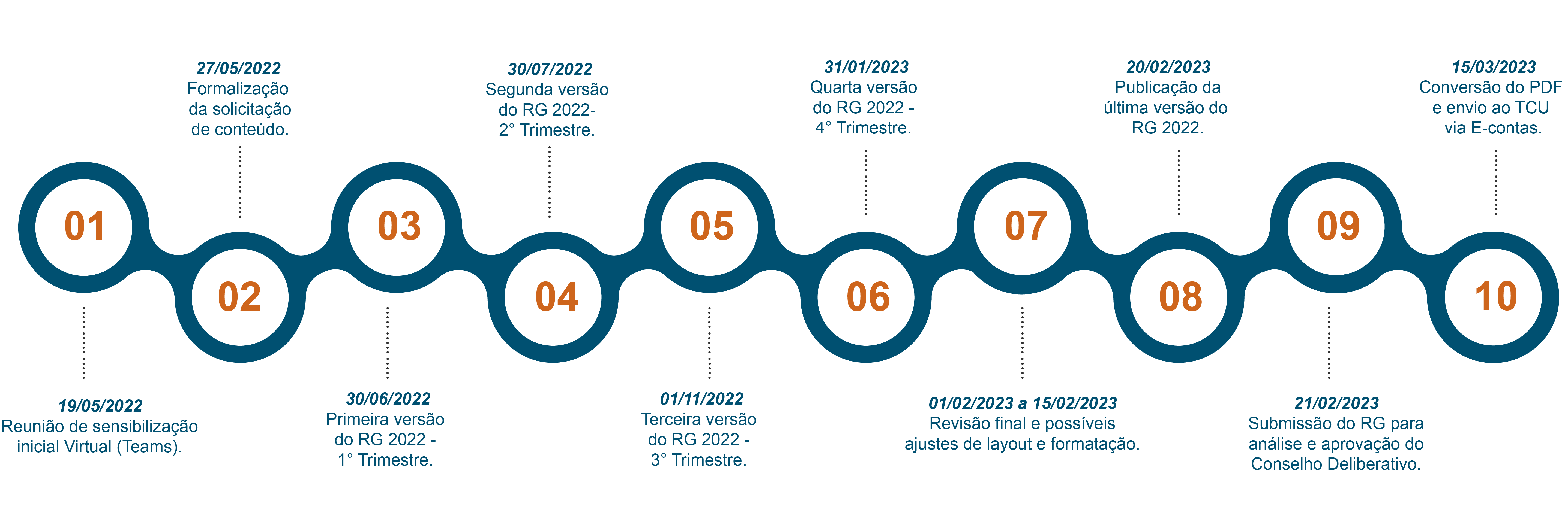 Por ser um conteúdo disponibilizado ao longo do exercício, ocorrem alterações ao longo do ano, com incremento e aprimoramento das informações. O esquema abaixo sintetiza as datas de referência para a apresentação do Relatório de Gestão referente ao ano de 2022:
