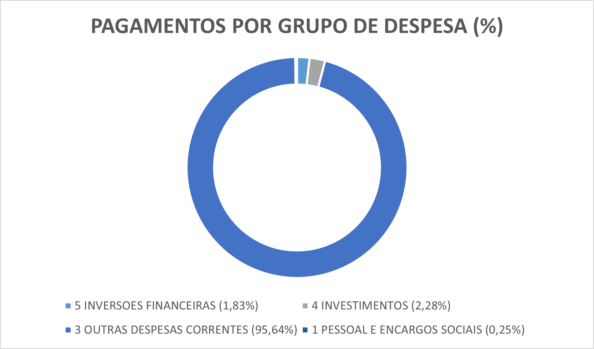 O gráfico a seguir, exibe os percentuais dos valores pagos, segregados por grupos de natureza da despesa (GND), classificação agregadora de elementos de despesa com as mesmas características quanto ao objeto de gasto. A mais representativa das naturezas - outras despesas correntes (95,64%) - está relacionada, principalmente, a gastos com transferências constitucionais e legais a Estados, Municípios e Distrito Federal, relativas aos programas e projetos educacionais financiados pelo FNDE. Por sua vez, as inversões financeiras estão vinculadas ao Programa FIES.