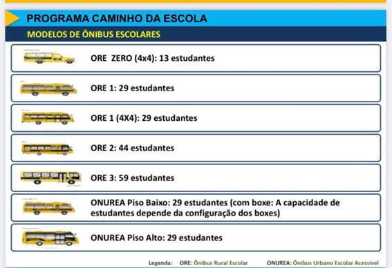 No primeiro semestre de 2022, o FNDE publicou um edital de pregão eletrônico para registro de preços de ônibus escolares do programa Caminho da Escola. O edital possibilitou a eventual aquisição de 7 mil veículos, para uso em áreas rurais e urbanas. No total, foram sete modelos diferentes de veículos: cinco do tipo Ônibus Rural Escolar (ORE), com capacidades que variam entre 13 e 59 estudantes sentados, e dois de Ônibus Urbano Escolar Acessível (Onurea), que podem receber até 29 alunos sentados. Todos os veículos possuem acessibilidade e devem ser equipados com dispositivo para transposição de fronteira para embarque e desembarque de estudantes com deficiência ou mobilidade reduzida.