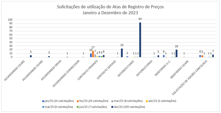 Ressalta-se que se encontrou vigente (até 29/6/2023) no primeiro semestre apenas Ata de Registro de Preços (ARP) nº 1/2022, oriunda do Pregão Eletrônico nº 02/2022, e que atingiu 100% de utilização em 17/02/2023. No mês de dezembro, foram disponibilizadas as ARPs nº 02/2023, 04/2023, 05/2023 e 08/2023.