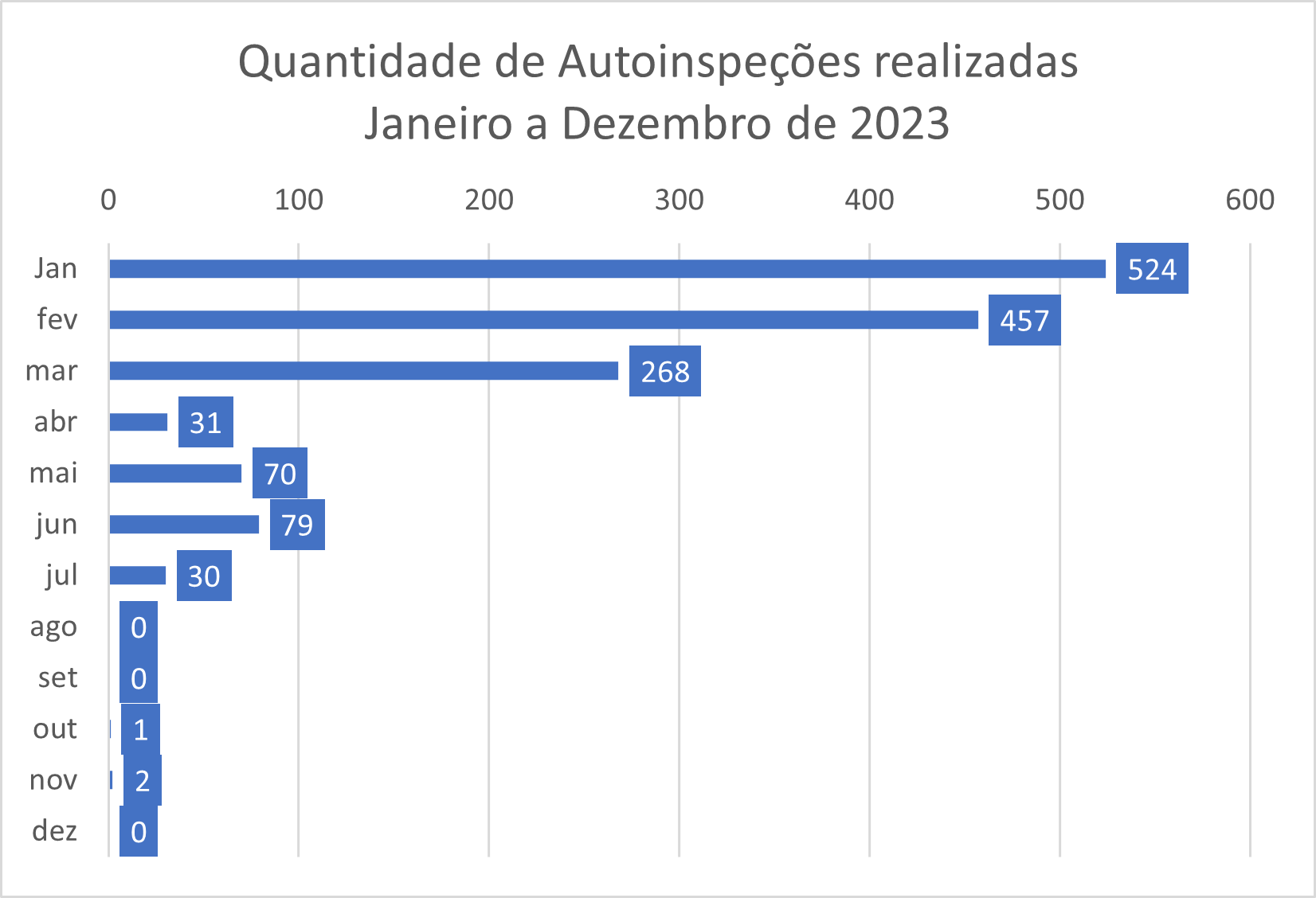 Durante a realização da 2ª Etapa do Controle de Qualidade das Atas de Registro de Preço, originárias do Pregão Eletrônico nº 2/2022, foram inspecionados 1.462 (mil quatrocentos e sessenta e dois) ônibus escolares, por meio do processo denominado “autoinspeção”, entre os meses de janeiro a dezembro de 2023, conforme demonstrado no gráfico abaixo.