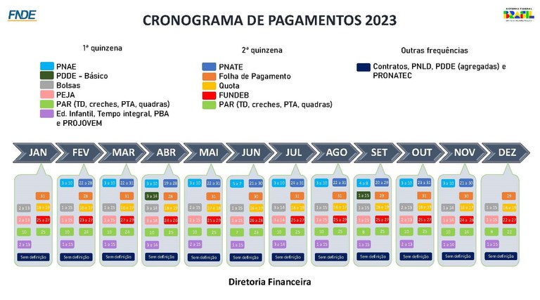 Na documento abaixo é possível acompanhar os meses em que são repassados os valores referentes às parcelas individuais de cada programa do FNDE: