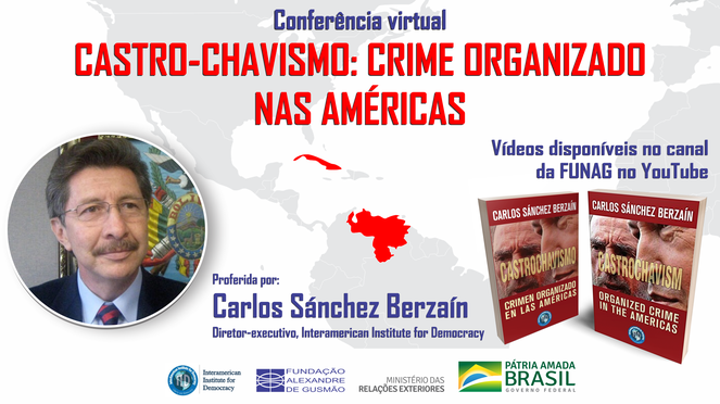 Fundação Alexandre de Gusmão (FUNAG) convida a assistir aos vídeos da conferência “Castro-chavismo: crime organizado nas Américas”, com Carlos Sánchez Berzaín, diretor-executivo do Interamerican Institute for Democracy, realizada no dia 30 de junho de 2020. Além da conferência completa, tal como transmitida ao vivo, a FUNAG disponibiliza vídeos mais curtos sobre os temas abordados pelo conferencista.