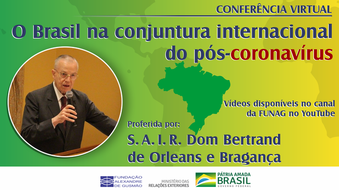 A Fundação Alexandre de Gusmão (FUNAG) convida a assistir aos vídeos da conferência proferida por S.A.I.R. Dom Bertrand de Orleans e Bragança sobre o Brasil na conjuntura internacional do pós-coronavírus no dia 16 de junho. Além da conferência completa, tal como transmitida ao vivo, a FUNAG disponibiliza vídeos mais curtos sobre cada tema abordado pelo conferencista.