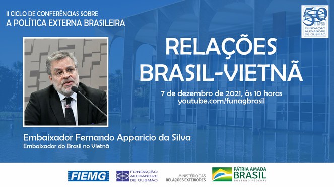 A FUNAG convida para a conferência do Embaixador do Brasil no Vietnã, Fernando Apparicio da Silva, em 7 de dezembro, às 10h (horário de Brasília). A apresentação, sobre as relações entre os dois países, será transmitida pelo canal da FUNAG no YouTube.