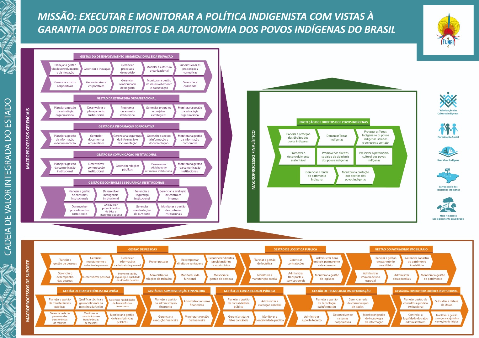 A Cadeia de Valor é composta por processos finalísticos, que correspondem aos processos relacionados à atividade-fim da Funai, ou seja, os processos que possuem um impacto direto na percepção de valor pela sociedade; por processos de suporte, que dão apoio e agregam valor para os processos finalísticos; e por processos gerenciais, que têm como propósito planejar, medir, monitorar e controlar todas as atividades nos níveis estratégico, tático e operacional, possuindo viés de orientação para toda a organização.