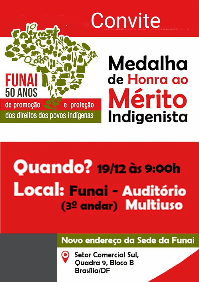 Nesta terça-feira (19), às 9h, a Fundação Nacional do Índio tem a honra de convidar para a Cerimônia de entrega da Medalha de Honra ao Mérito Indigenista, concedida às autoridades públicas e cidadãos que se destacaram na luta em favor dos povos indígenas brasileiros. Presenças confirmadas do Ministro da Justiça e Segurança Pública, Torquato Jardim; do Comandante do Exército Brasileiro, General Eduardo Dias da Costa Villas Bôas; e do Cacique Raoni Metuktire.