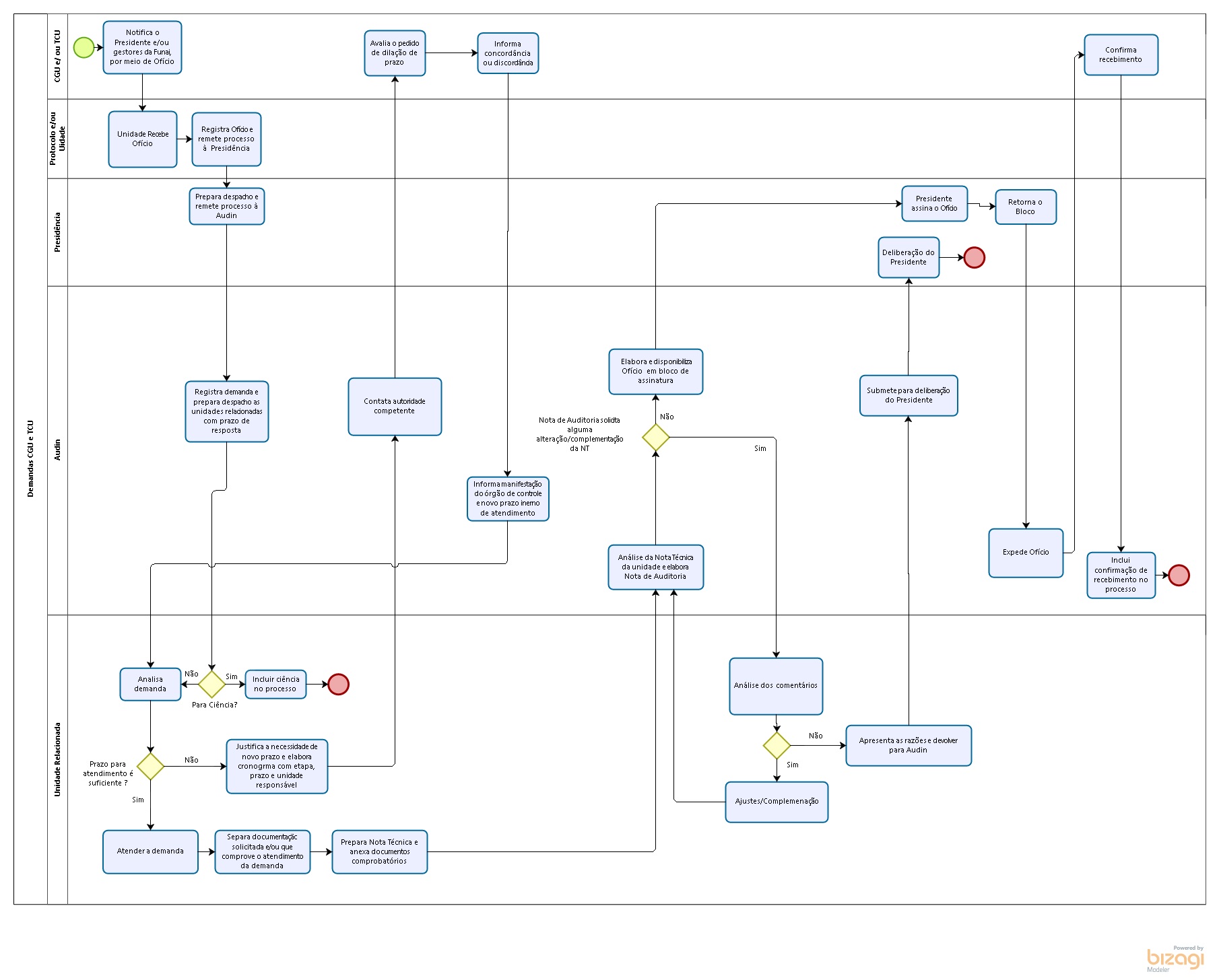 Com o objetivo de acompanhar o atendimento pelas unidades da Funai às demandas do Ministério da Transparência e Controladoria-Geral da União (CGU), do Tribunal de Contas da União (TCU) e da própria Auditoria Interna da Funai, a Portaria Nº 1505/PRES estabelece o fluxo de processos e os prazos para que essas unidades respondam aos pedidos de informações desses órgãos de controle.