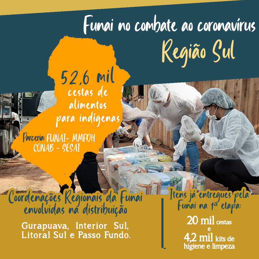 Quatro Coordenações Regionais da Funai estão envolvidas na entrega: Guarapuava, Interior Sul, Litoral Sul e Passo Fundo. Confira a localização de cada uma aqui. Em todas as ações os servidores utilizam equipamentos de proteção individual (EPIs) como toucas, luvas e máscaras descartáveis, de modo a minimizar as possibilidades de contágio. As cestas passam também por um processo de higienização antes da distribuição.