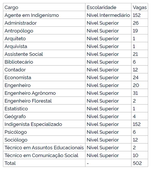 A Fundação Nacional dos Povos Indígenas (Funai) irá participar do Concurso Nacional Unificado. O certame oferecerá, ao todo, 502 vagas de níveis superior e intermediário para o órgão indigenista.