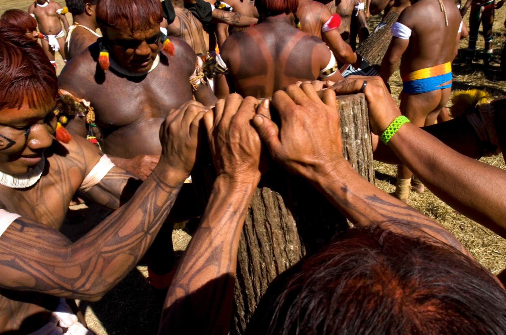 Elementos simbólicos, como os troncos ornamentados e a interação com a natureza ao redor, desempenham papel essencial nesse rito, que busca honrar os ancestrais e fortalecer os laços e a coesão social da comunidade.