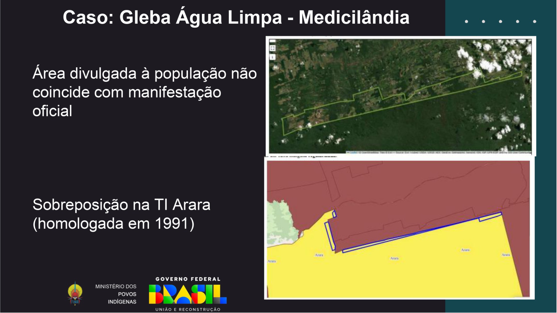 Entre as áreas que têm causado preocupação aos moradores do Pará, está a Gleba Federal Rural Água Limpa, localizada no município de Medicilândia. A Funai manifestou interesse somente na porção territorial que se sobrepõe integralmente à Terra Indígena (TI) Arara. Ou seja, trata-se de uma área localizada dentro do território regularizado, de ocupação tradicional do povo Arara do Pará, e não de área limítrofe à TI, como foi divulgado de forma equivocada. Há também outras glebas nas quais o interesse da Funai é em uma porção territorial inferior à área total da gleba. Confira nos mapas abaixo: