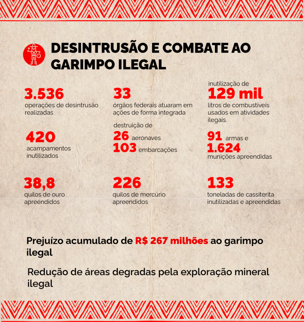 Apenas em 2024, 3.536 operações de segurança impuseram à rede criminosa do garimpo ilegal um prejuízo no valor de R$ 267 milhões e consolidaram uma redução de 95,76% nas novas áreas de garimpo, que caíram de 1.002 hectares explorados em 2022 para apenas 42 hectares em 2024. O combate intenso resultou em uma redução de 91% nas áreas já impactadas pelo garimpo na Terra Indígena Yanomami (TIY). Dados do Centro Gestor e Operacional do Sistema de Proteção da Amazônia (Censipam) mostram que o garimpo ativo diminuiu de 4.570 hectares, em março, para 313,6 hectares, em dezembro.